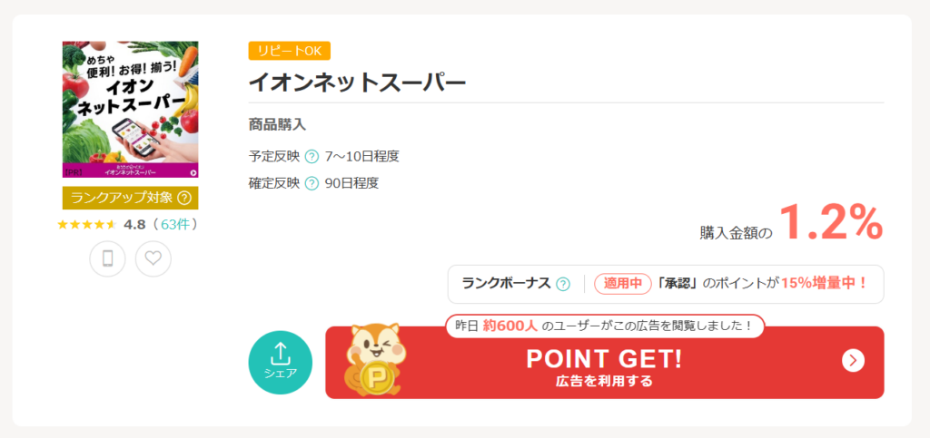 でも一つだけ、イオンネットスーパーでよりお得に商品を注文できる方法があるんです!それがお小遣いサイトのモッピーを経由してイオンネットスーパーを利用する…という方法。イオンネットスーパーで買いたい商品を注文する前に、一度モッピーにログインするだけでいいんです。たったそれだけで購入金額の1.5%のポイントがキャッシュバックされます!