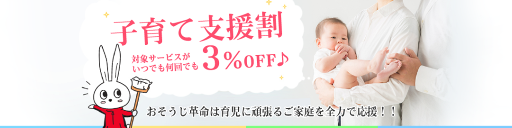 おそうじ革命には、妊娠中・子育て家庭を応援する「子育て支援割(3%OFF)」というプレママ・ママ向け特典が用意されています。