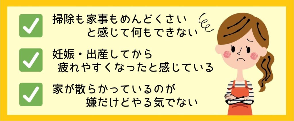 妊娠してから「家事をする気力がない」「疲れて掃除できない」「家が散らかって気分も下がる」…と感じていませんか?